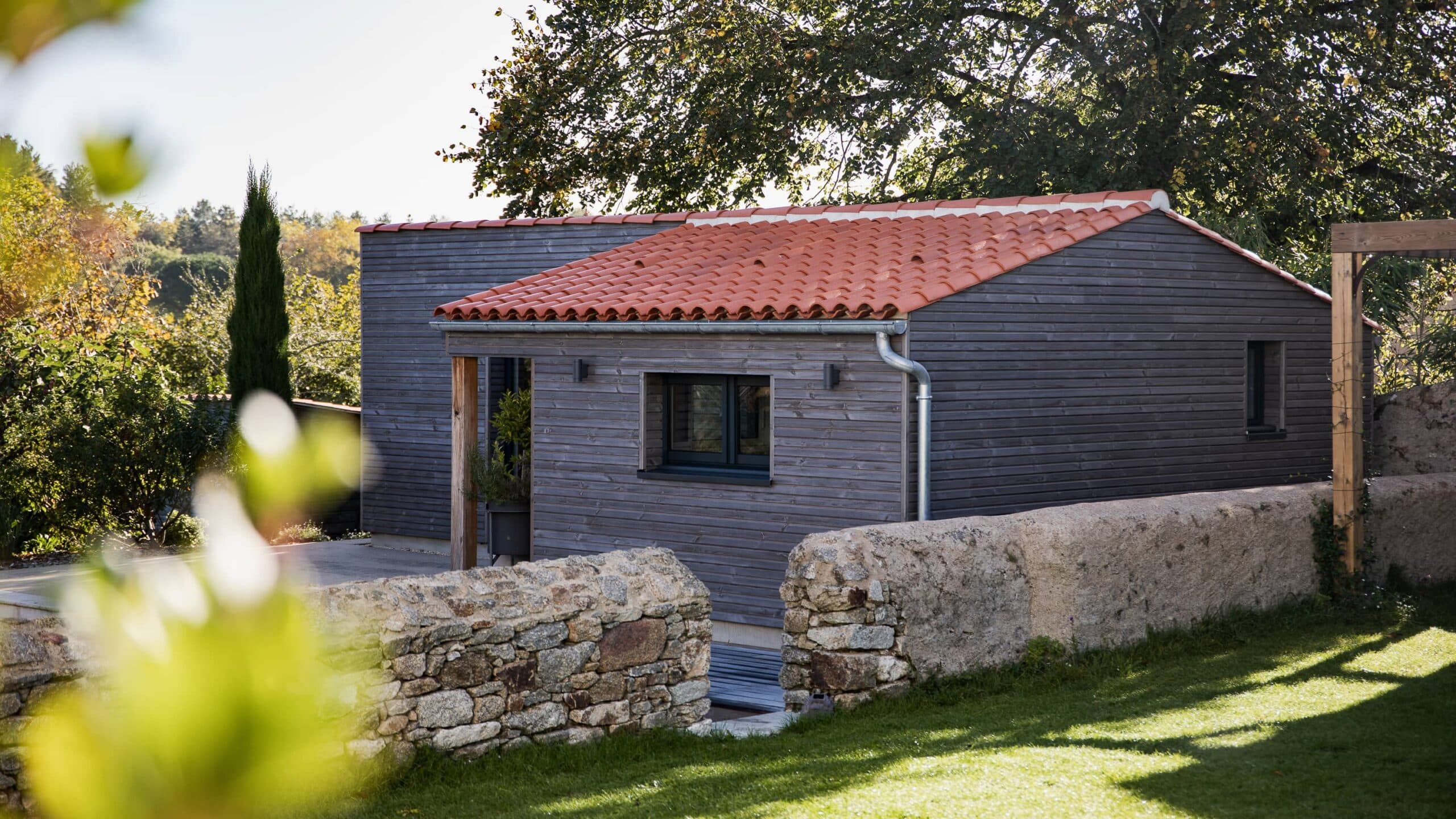 🔹 Poolhouse revisité : couverture en tige de botte, menuiseries neuves et bardage bois pré-grisé pour une intégration discrète et élégante.