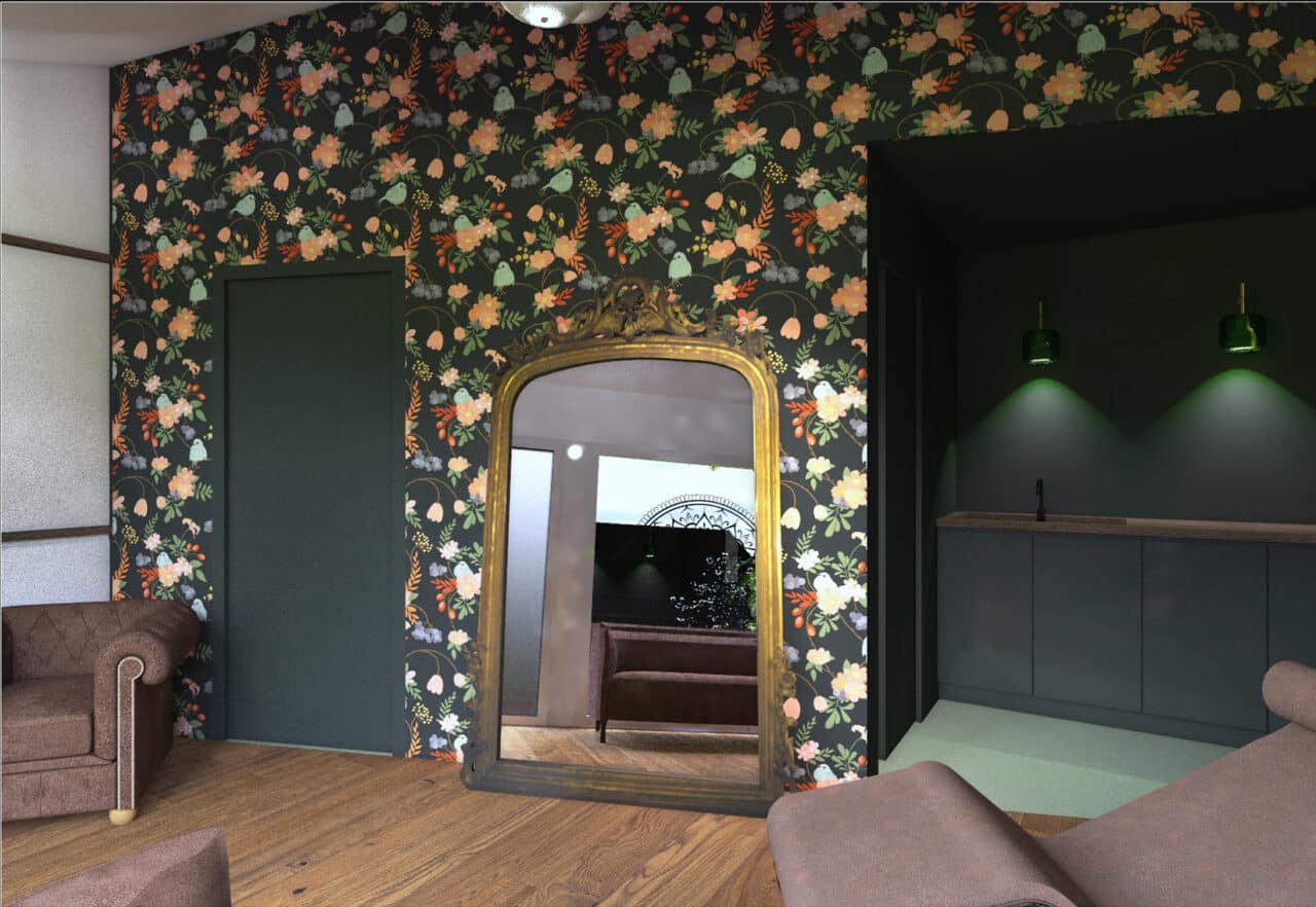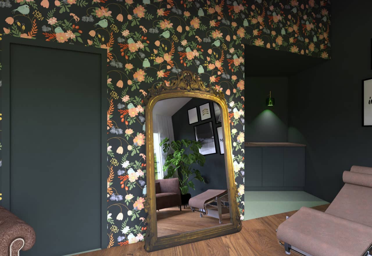 L’ambiance intérieure marie confort et caractère : un mur d’accent sombre renforce l’ambiance intimiste du lieu, tandis que le papier peint floral vient apporter une touche de fantaisie. Le mobilier, aux lignes sobres accompagné de grandes plantes vertes renforcent l’ambiance chaleureuse et accueillante du lieu.