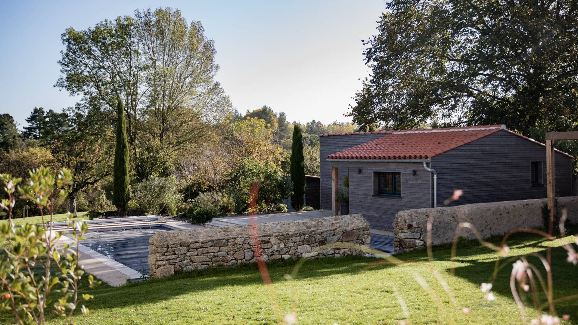 Le pool house a été modernisé, la couverture remplacée par de la tige de botte, les menuiseries remplacées et l’ensemble bardé de bois pré-grisé s’insérant sobrement dans l’environnement existant. Le carport reprend le même bardage, créant ainsi une continuité entre les deux ensembles.